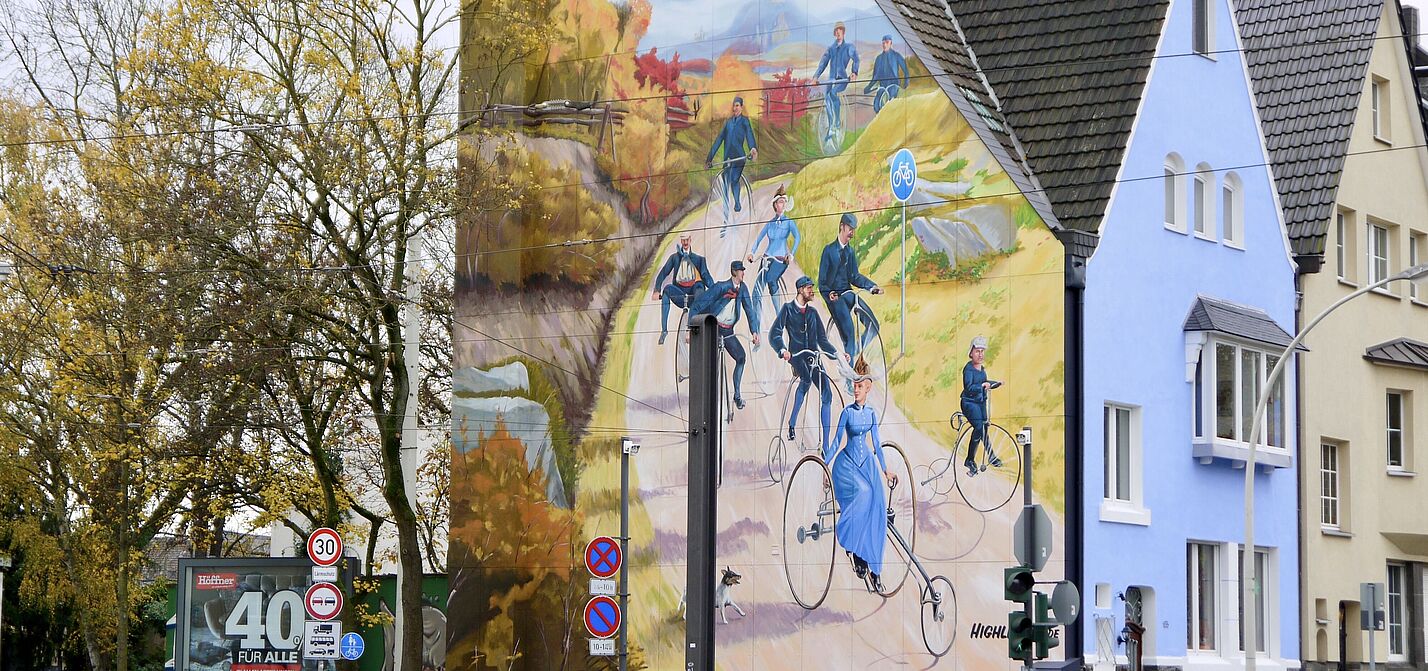 Die Neubürgertouren starten immer am 1. Samstag im Monat um 14 Uhr auf der Schlossweiherbrücke vor dem Poppelsdorfer Schloss. Zur Premiere am 5. April wird Tourenleiterin Gabriele Heix den Teilnehmern besondere Streetart-Projekte in Bonn vorstellen. Das Fahrrad ist dafür ganz ideal, beispielsweise um die großflächige Gestaltung einer kompletten Hauswand mit der Szene eines nostalgischen Fahrradausfluges um die Jahrhundertwende in der Südstadt zu genießen.